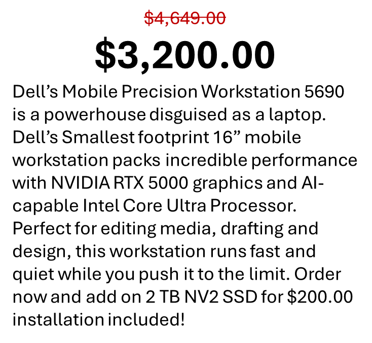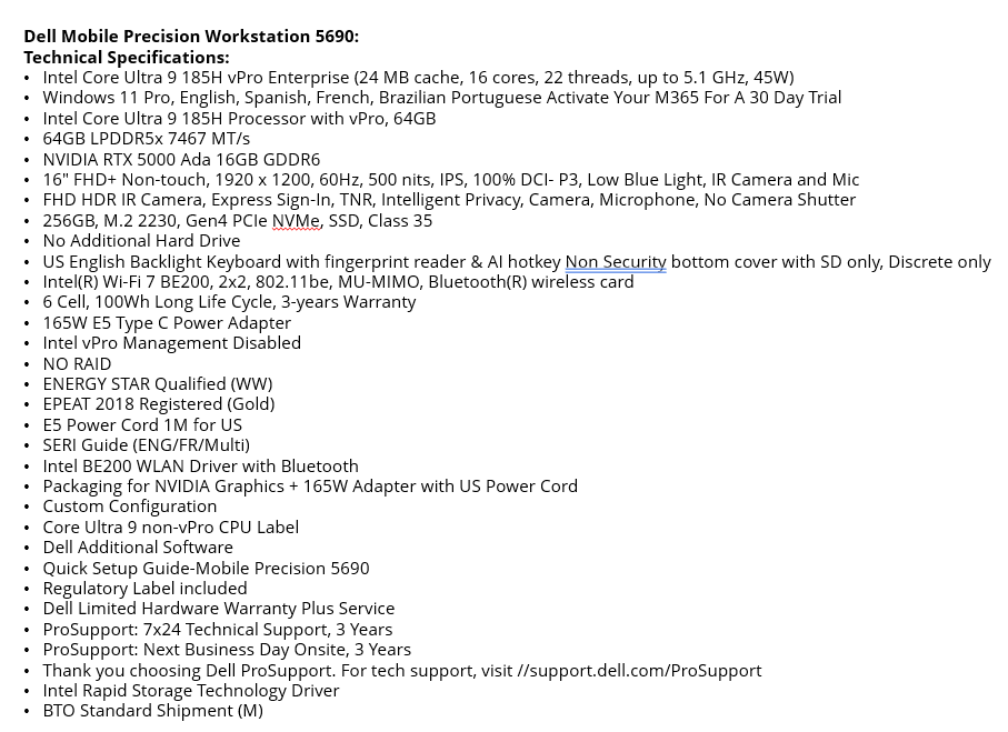 Dell Mobile Precision Workstation 5690 - Ultra 9 185H, W11P, 64GB, 256GB, NIVIDIA RTX 5000 16GB, 16" Non-Touch, 10Whr Long-Life Battery, 165W Type-C Power Adapter, 3 Year ProSupport